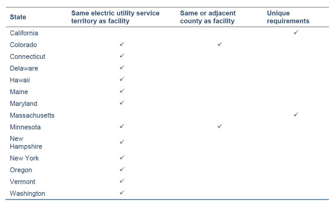Most commonly, these policies require that eligible residential customers and the community shared solar facility be located within the same electric utility service territory (Connecticut, Delaware, Hawaii, Maine, Maryland, New Hampshire, New York, Oregon, Vermont, and Washington).[vi] Two (Colorado and Minnesota) are more restrictive and limit customer eligibility by requiring that subscribers be located in the same utility service territory and within the same or an adjacent county to the facility.